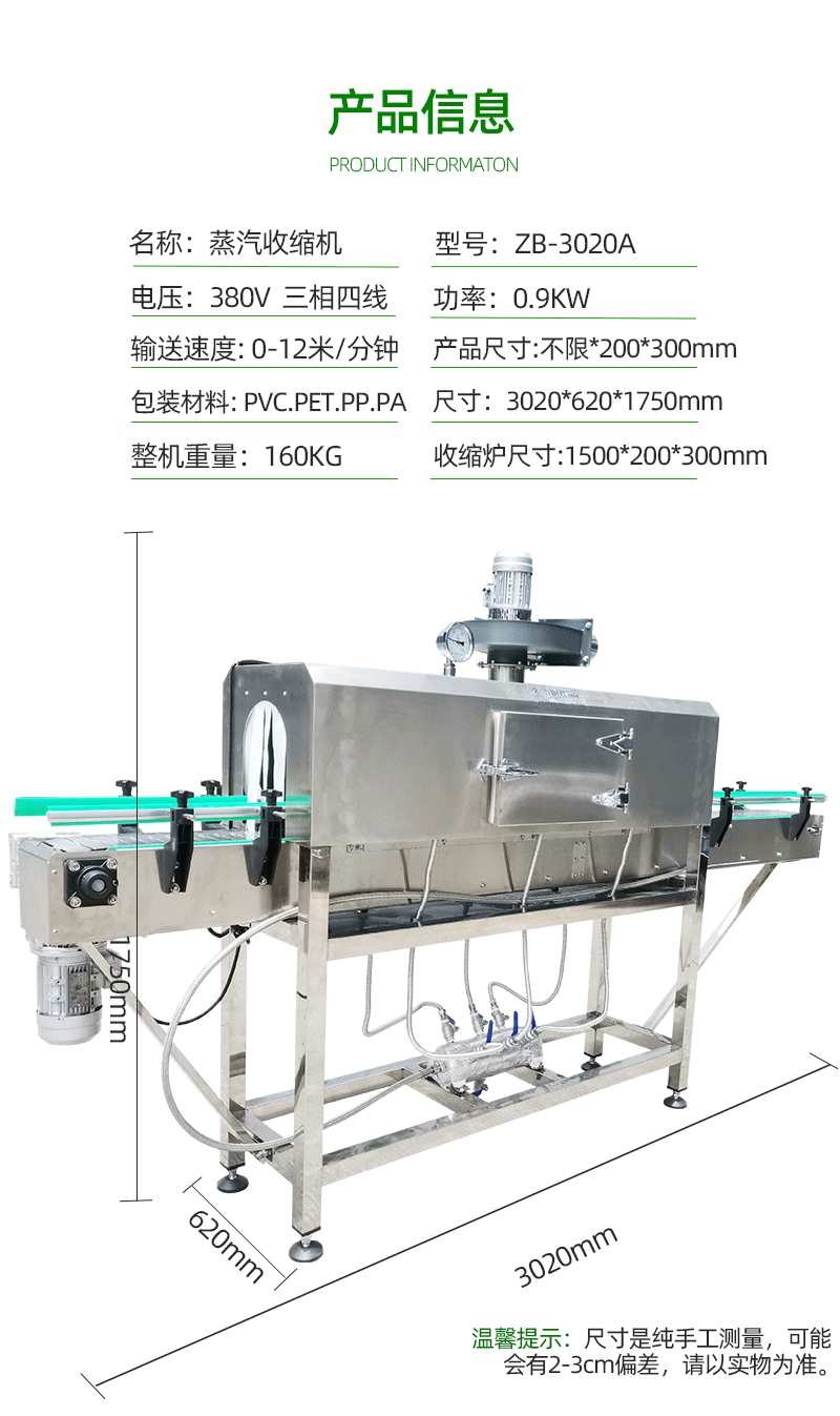 - 參數調整:根據機器的使用情況和包裝要求,定期檢查和調整蒸汽收縮機的參數。例如,檢查蒸汽溫度、傳送帶速度和蒸汽噴射時間等參數是否與實際包裝材料和產品相匹配。如果發現收縮效果不理想,如包裝材料收縮不緊密或出現褶皺,可以適當調整蒸汽溫度和噴射時間;如果產品在傳送帶上運輸不順暢,可以調整傳送帶速度。