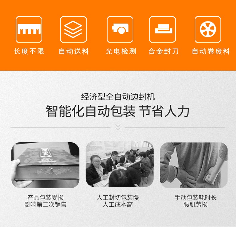 全自動(dòng)邊封熱收縮包裝機(jī)自動(dòng)化程度高,邊封設(shè)計(jì)使產(chǎn)品包裝長(zhǎng)度無(wú)限制