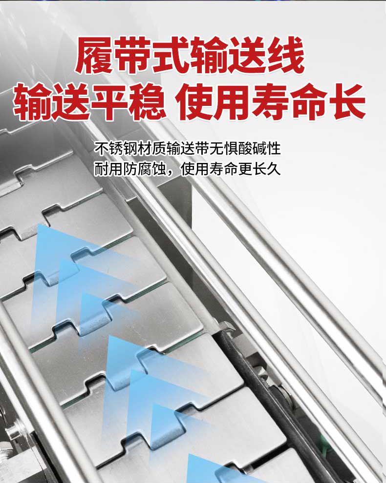 • 傳動系統:采用網帶、鏈板或滾筒輸送產品,速度可變頻調節,通常為 0.5-10m/min,以適應不同產能需求。