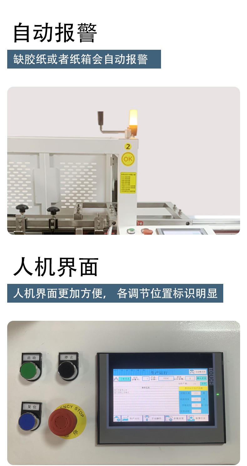 3. 自動(dòng)化連續(xù)作業(yè),降低無(wú)效工時(shí)設(shè)備通過(guò) PLC + 觸摸顯示屏實(shí)現(xiàn)全流程自動(dòng)控制,可完成吸箱、開(kāi)箱、成型、折底、封底的一體化操作,無(wú)需人工介入單個(gè)工序。同時(shí)配備缺料提前報(bào)警、無(wú)料自動(dòng)停機(jī)等裝置,避免空轉(zhuǎn)浪費(fèi),有效提升設(shè)備的有效作業(yè)率,減少人工值守的無(wú)效工時(shí)。