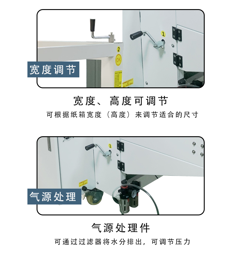 • 紙箱適應(yīng)性強(qiáng):適用紙箱范圍廣,不同大小紙箱調(diào)整簡(jiǎn)便快捷,變換紙箱規(guī)格時(shí),手動(dòng)調(diào)整一般只需 1-2 分鐘。