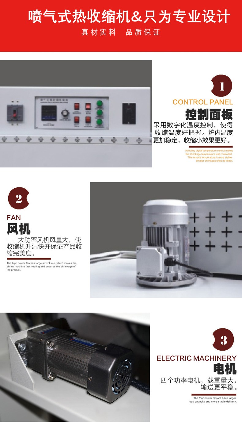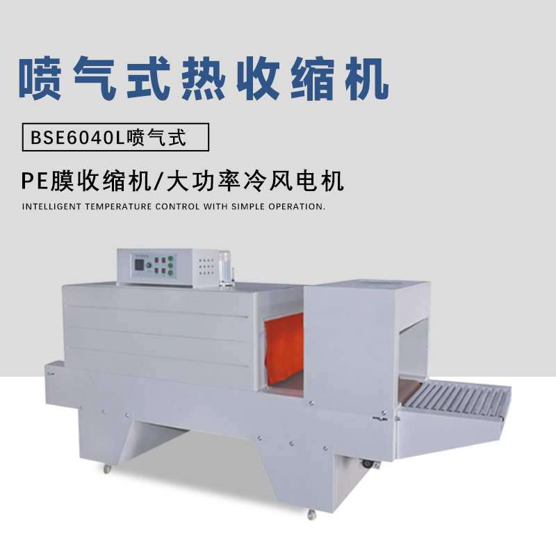 - 基本原理:噴氣式熱收縮機主要是利用熱空氣循環的原理來工作。它通過加熱裝置將空氣加熱到一定溫度,然后利用風機將熱空氣高速噴射到包裝好的產品表面。包裝材料(通常是熱收縮薄膜)在熱空氣的作用下受熱收縮,緊密地貼合在產品表面,從而達到包裝美觀、防潮、防污等效果。