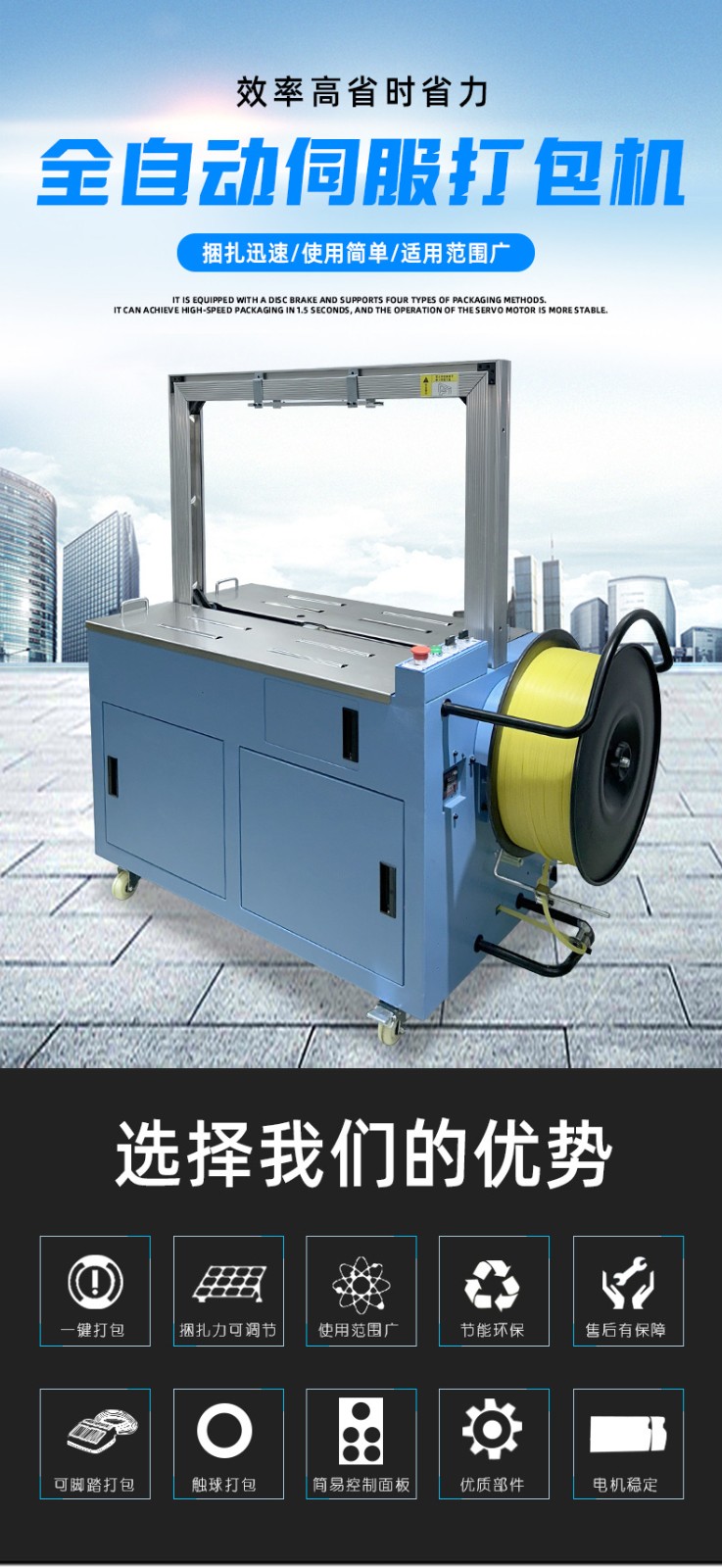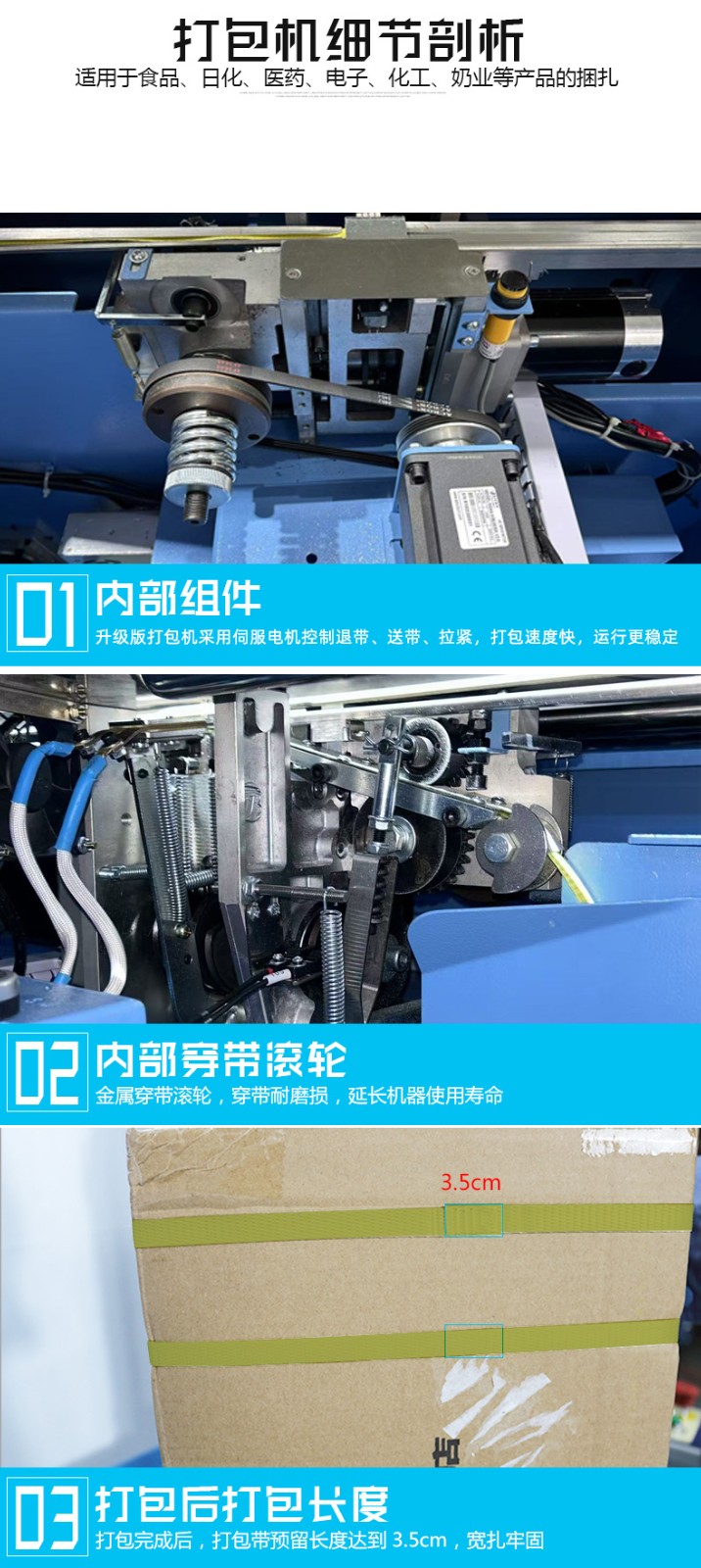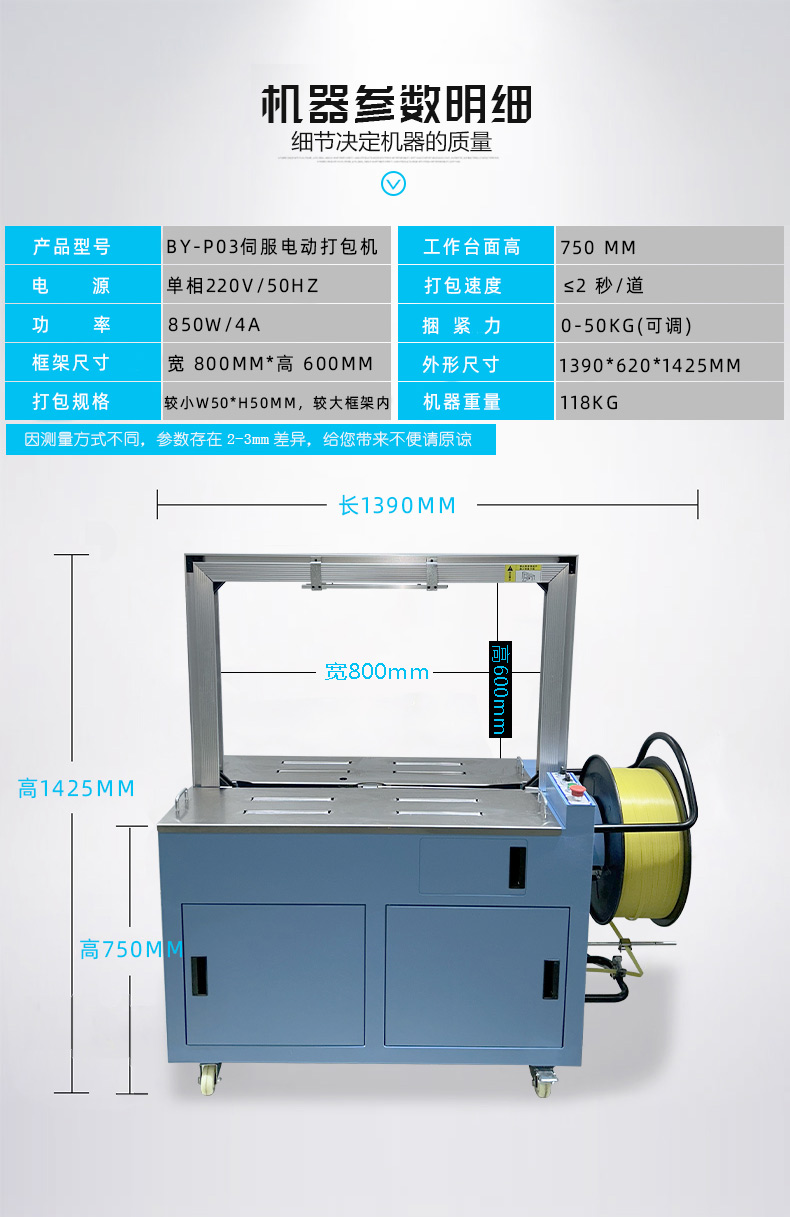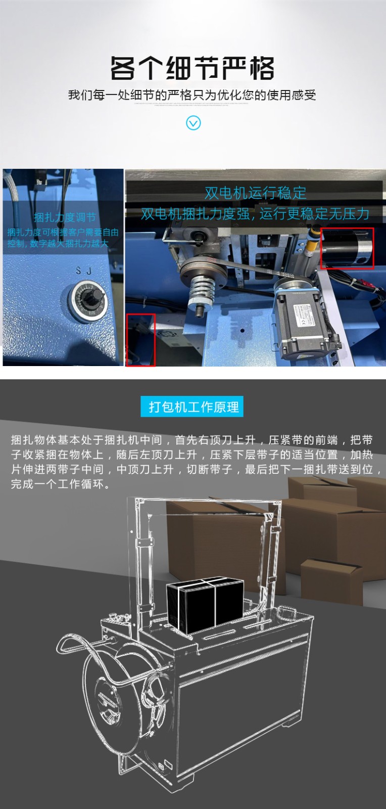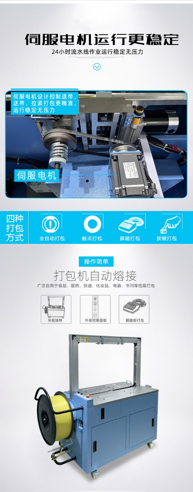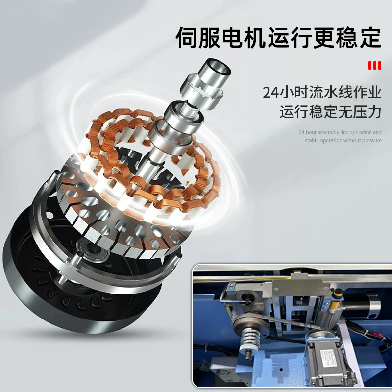 • 捆扎打包:根據預設的參數,伺服電機驅動打包帶圍繞物品進行捆扎。在捆扎過程中,伺服電機精確控制打包帶的張力,確保打包帶能夠緊密地貼合在物品表面,同時又不會對物品造成損壞。完成捆扎后,切斷機構會自動將打包帶切斷,并對末端進行熱封或其他方式的處理,防止打包帶松開。
