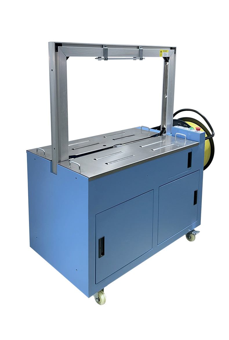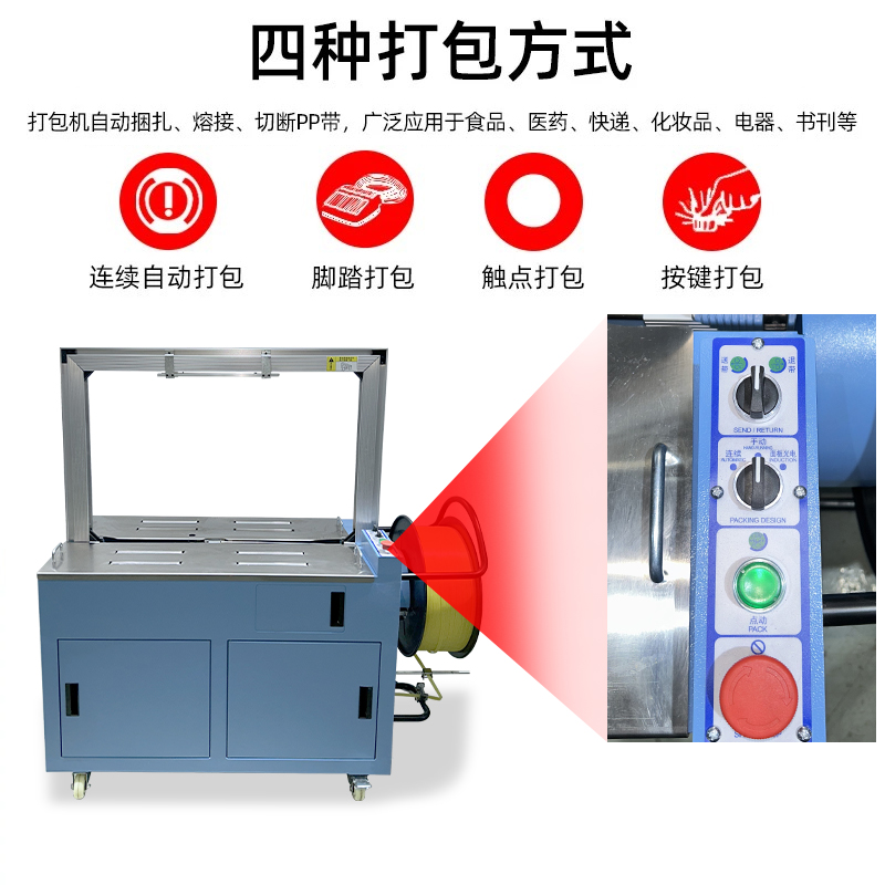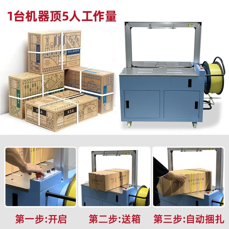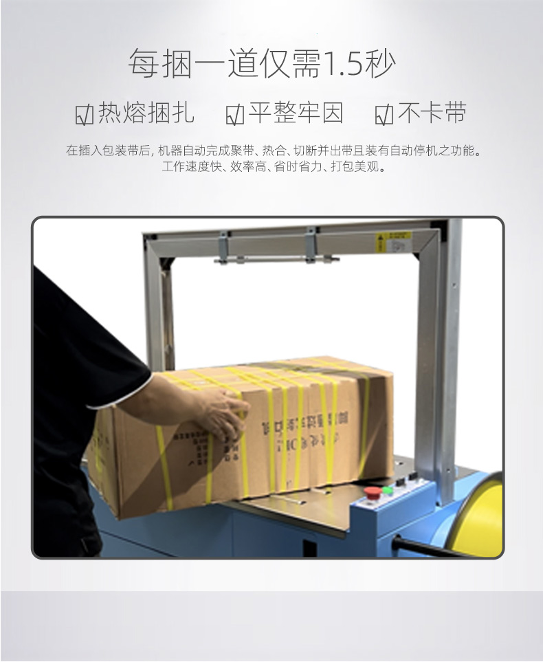 • 自動上帶:機器啟動后,會自動從打包帶卷中抽出打包帶,并將其傳送到預定的位置,準備進行打包。這個過程無需人工干預,大大提高了工作效率。