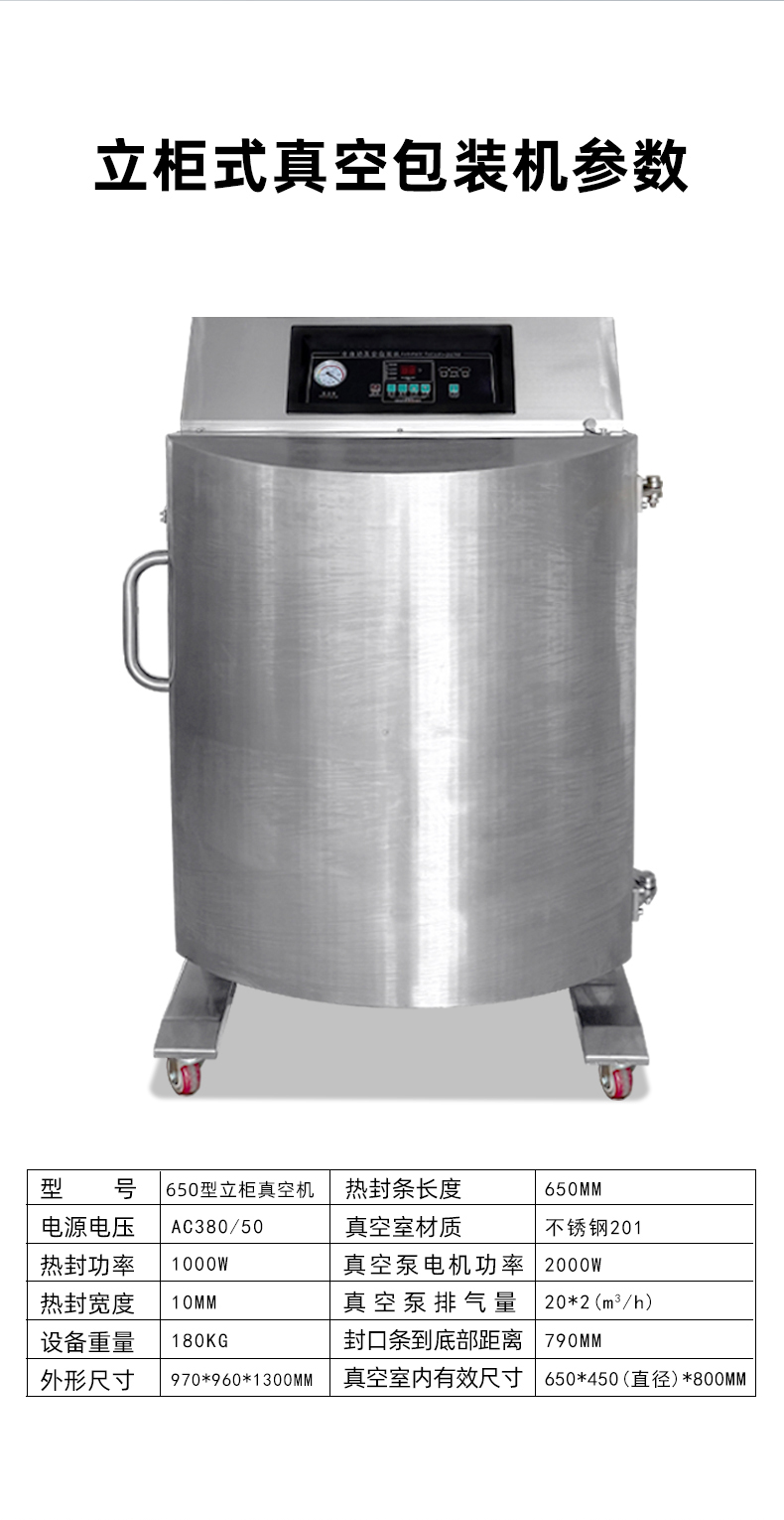 - 大容量真空室:立柜式真空包裝機的真空室容積較大,如 DZ-650L 型號,其熱封有效尺寸可達(dá) 650×8mm,可同時處理大批量食材或大尺寸包裝,能滿足整只火腿、海鮮禮盒、大桶粉末顆粒等特殊形狀物品的封裝需求49。
