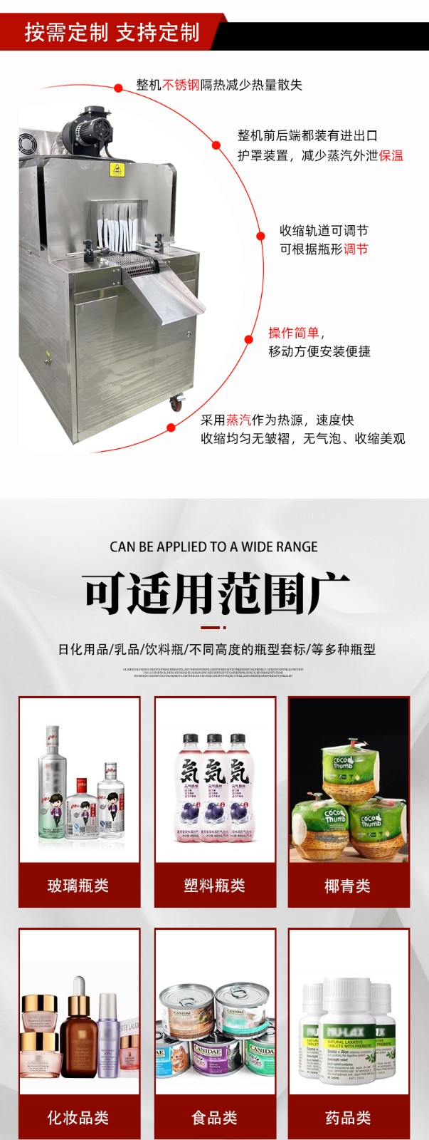 1. 食品飲料行業:用于瓶裝飲料、易拉罐、醬料瓶的標簽收縮,蒸汽加熱能避免高溫破壞食品,同時標簽貼合度高,提升產品外觀檔次。
