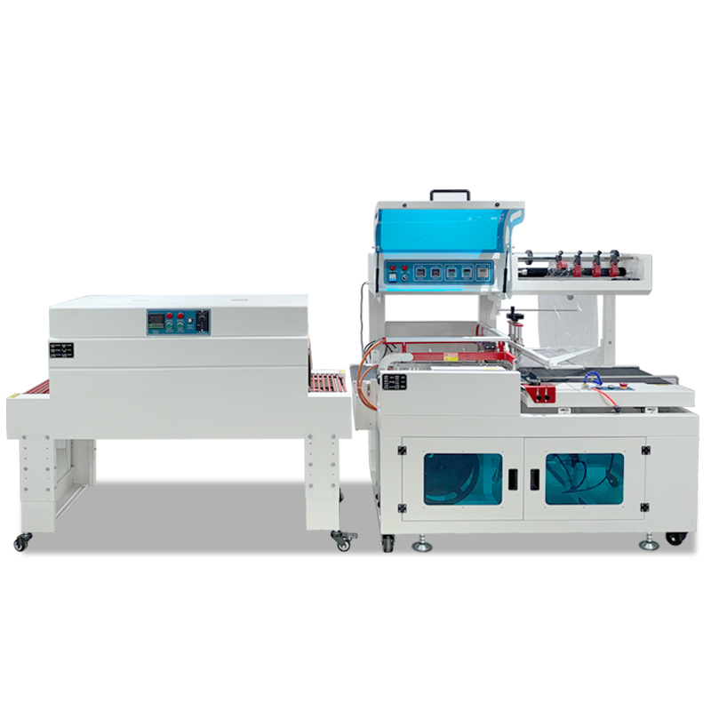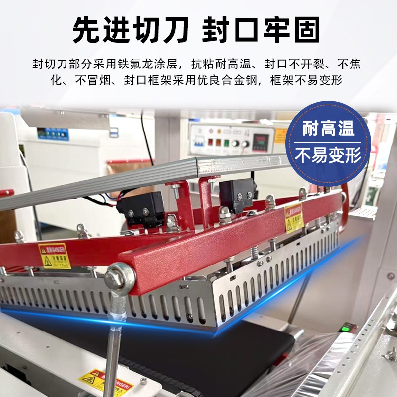 - L 型封切刀(由橫向刀和縱向刀組成,呈 “L” 形)快速下壓,同時通過 “熱封 + 切斷” 一體化動作:先通過加熱條將膜的重疊處熱封(形成密封的 “膜袋” 套住產品),再通過內置切刀切斷多余膜料,完成 “套膜” 工序;