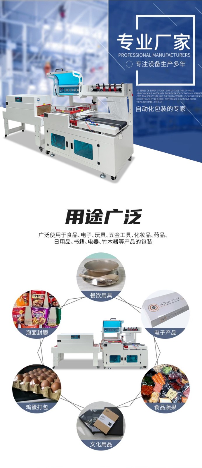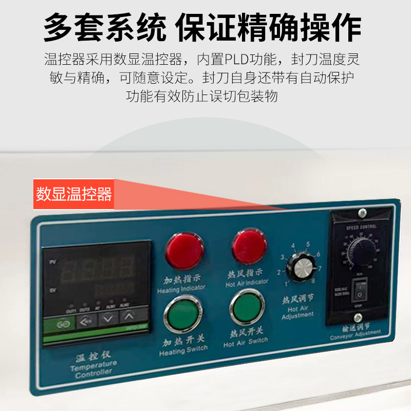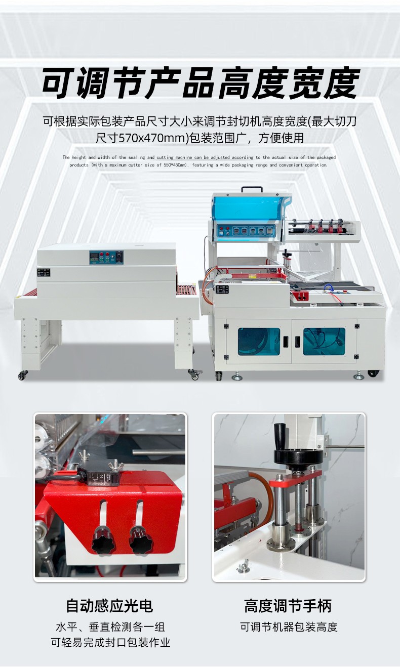 - 設備可通過調節 “輸送帶速度、封切溫度、收縮溫度”,適配不同尺寸產品(通常適用產品尺寸:長 50-600mm、寬 30-400mm、高 20-300mm),從小件(如口紅、藥盒)到中件(如禮盒、小家電)均可包裝。
