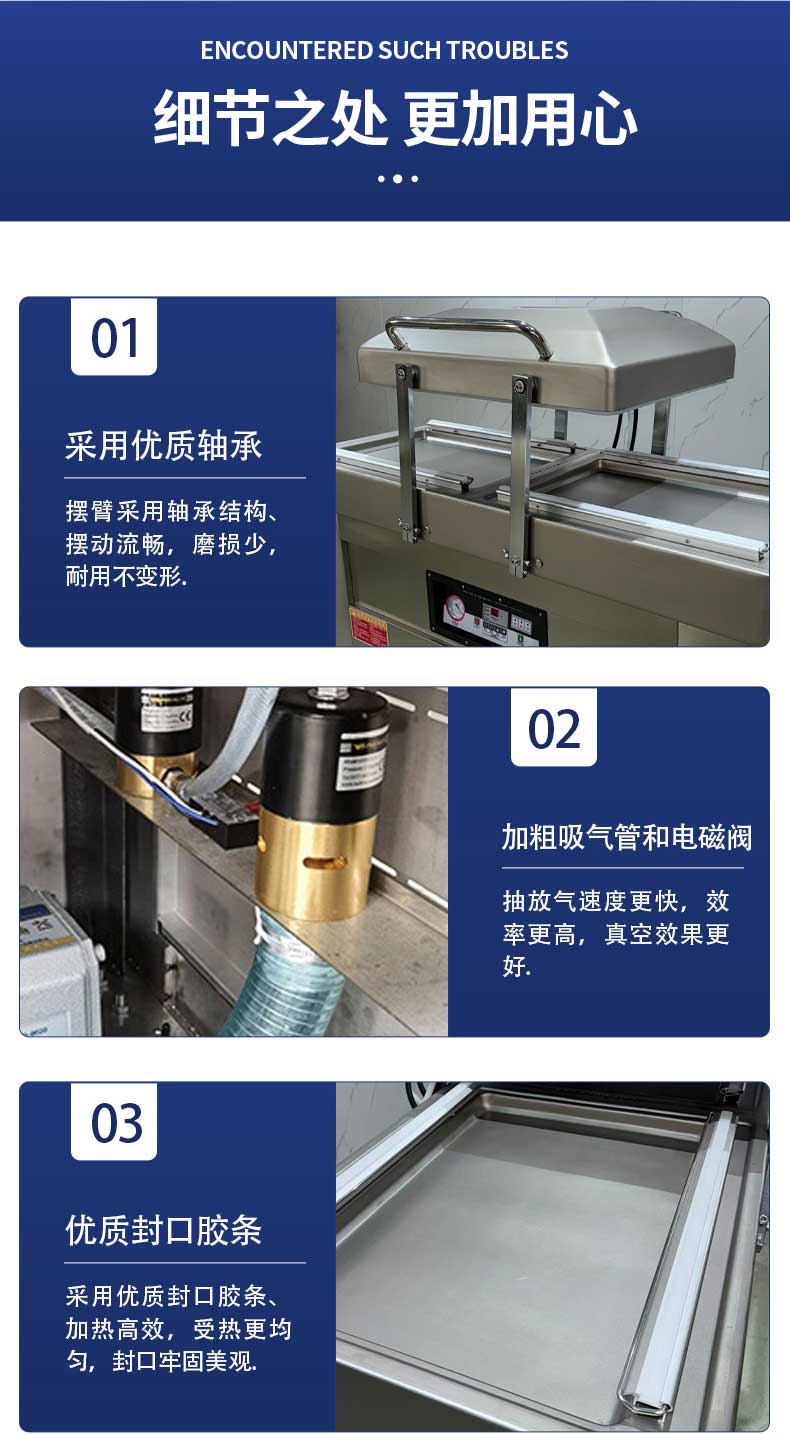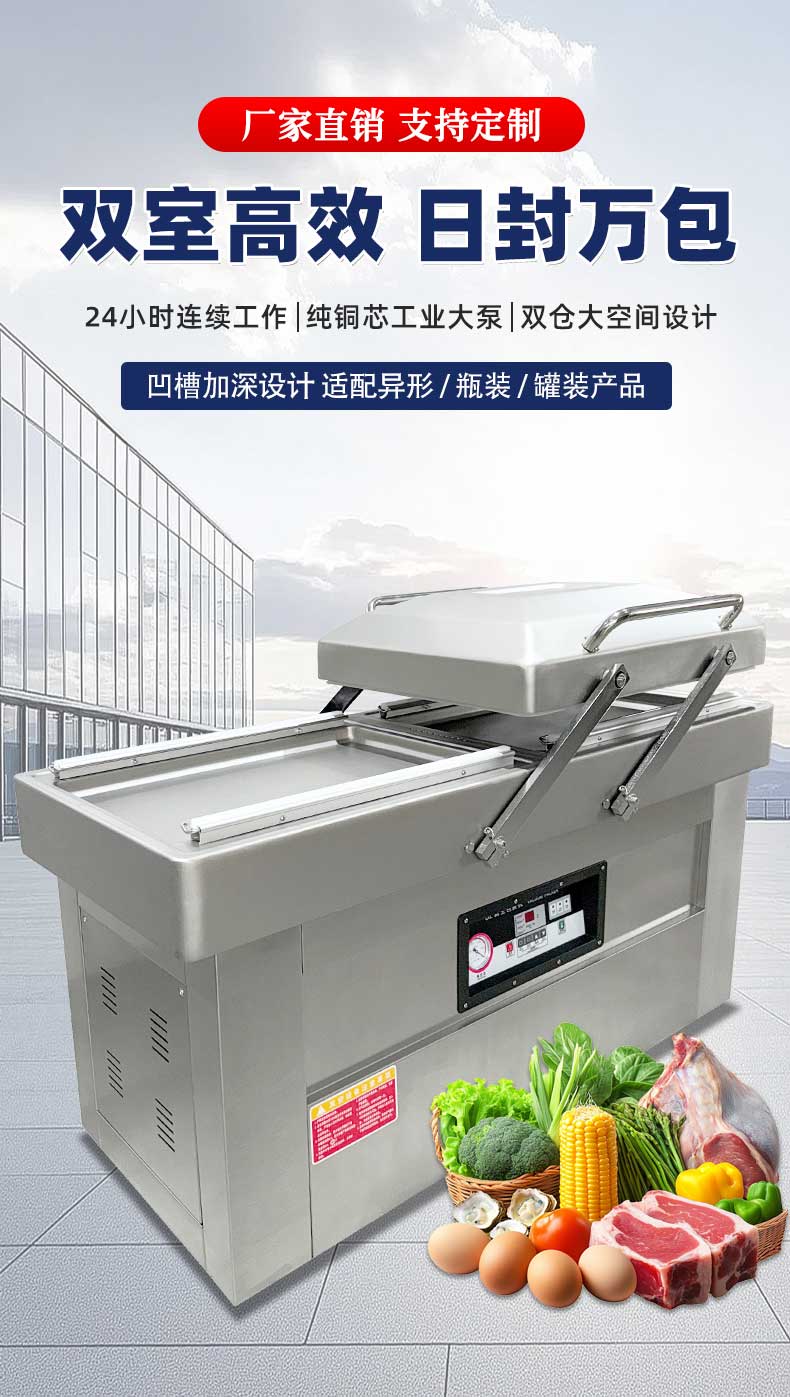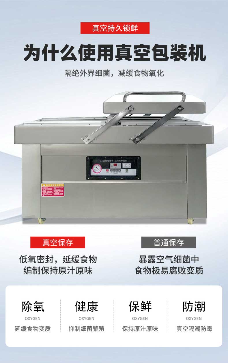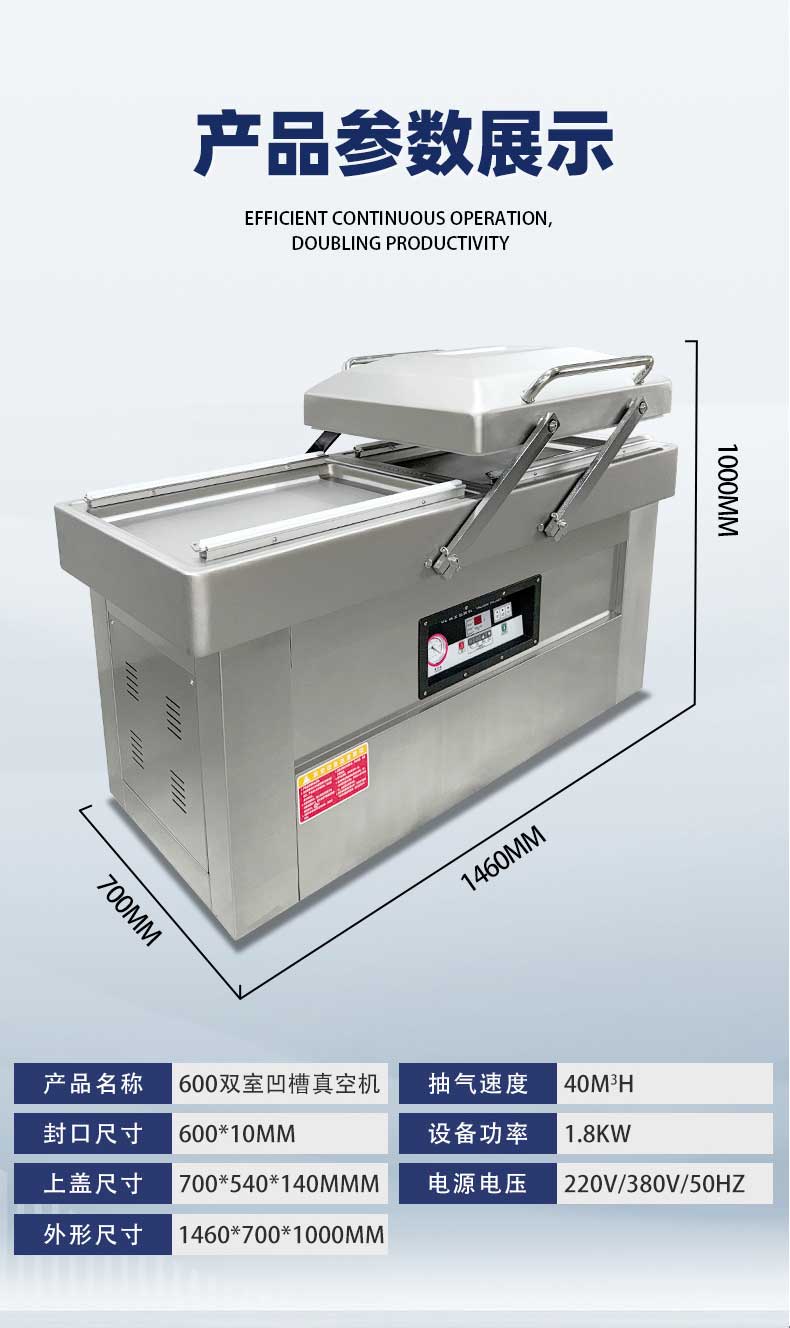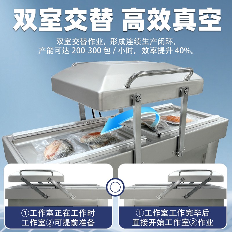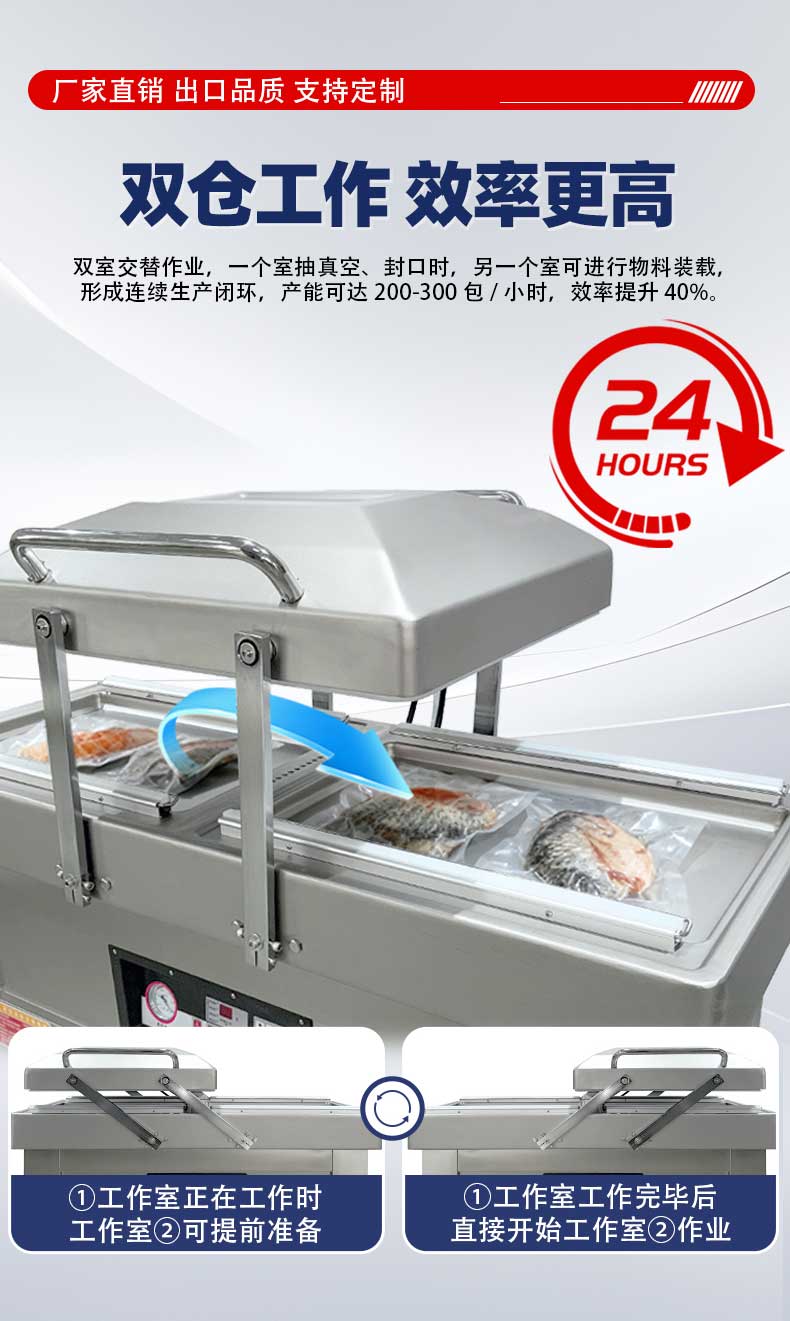 - 雙室設計:一個真空室在抽真空時,另一個真空室可以擺放包裝物,交替工作,節(jié)省操作時間,提高包裝效率。
