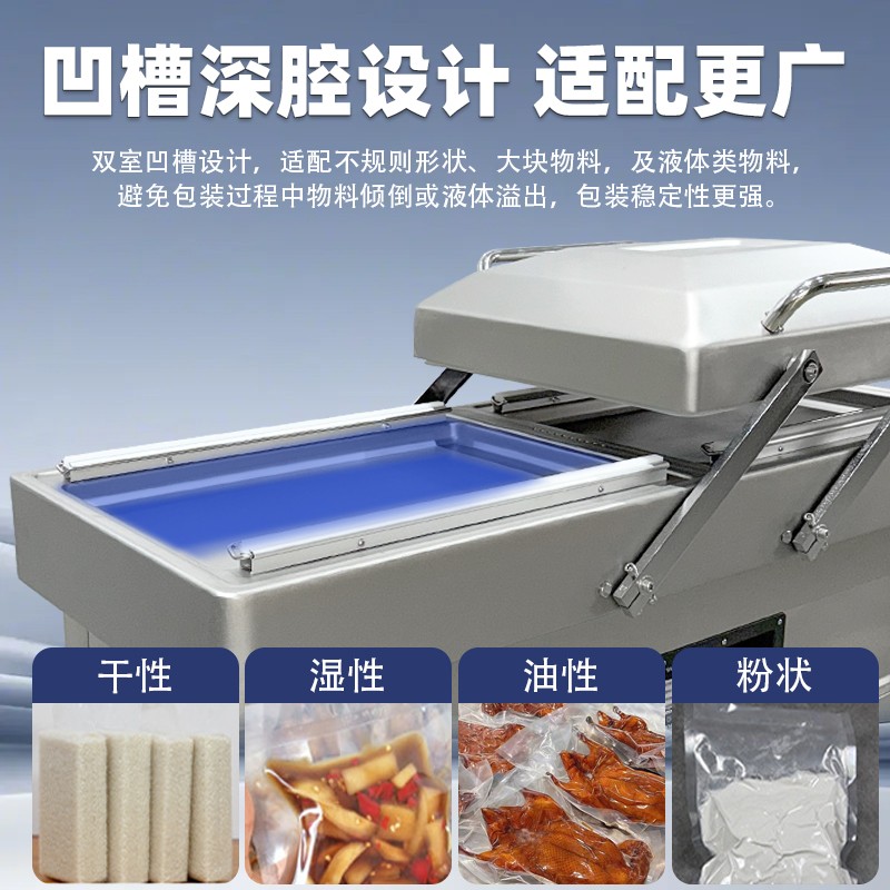 雙室凹槽真空包裝機,專為鹵味、水產(chǎn)、預制菜等帶湯汁、高水分產(chǎn)品量身打造,創(chuàng)新下凹式真空室結構搭配雙室交替工作模式,既解決液體包裝溢漏難題,又大幅提升生產(chǎn)效率,是食品加工、生鮮鎖鮮的得力設備。