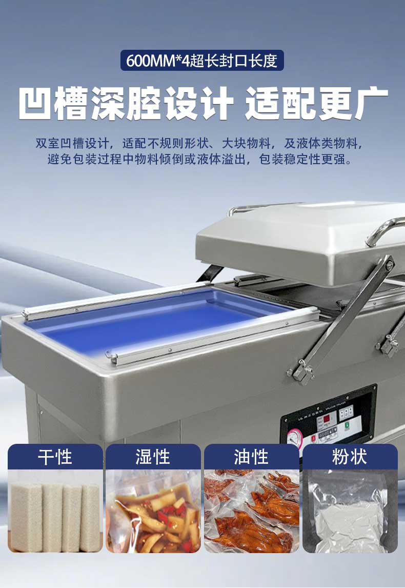 下凹式真空室深度支持定制,產(chǎn)品放置后呈傾斜狀態(tài),抽真空時湯汁牢牢鎖在凹槽內(nèi),不會流向封口處;傾斜適配的加熱條與硅膠條緊密貼合,封口平整牢固,杜絕漏封滲漏問題。雙室獨立運行設計,一個腔室抽真空封口的同時,另一個腔室可同步擺放待包裝產(chǎn)品,無縫銜接無空窗期,包裝效率較單室機型提升 50% 以上。