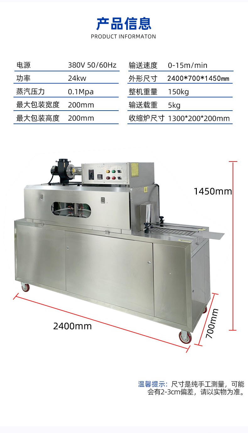 - 智能控溫,適配多類膜材配備 PLC 智能控制系統,可精準調節蒸汽溫度(50℃-120℃可調)、輸送速度與蒸汽噴射量,兼容 POF、PVC、PE 等多種熱收縮膜材,滿足不同產品的包裝厚度與質感要求。